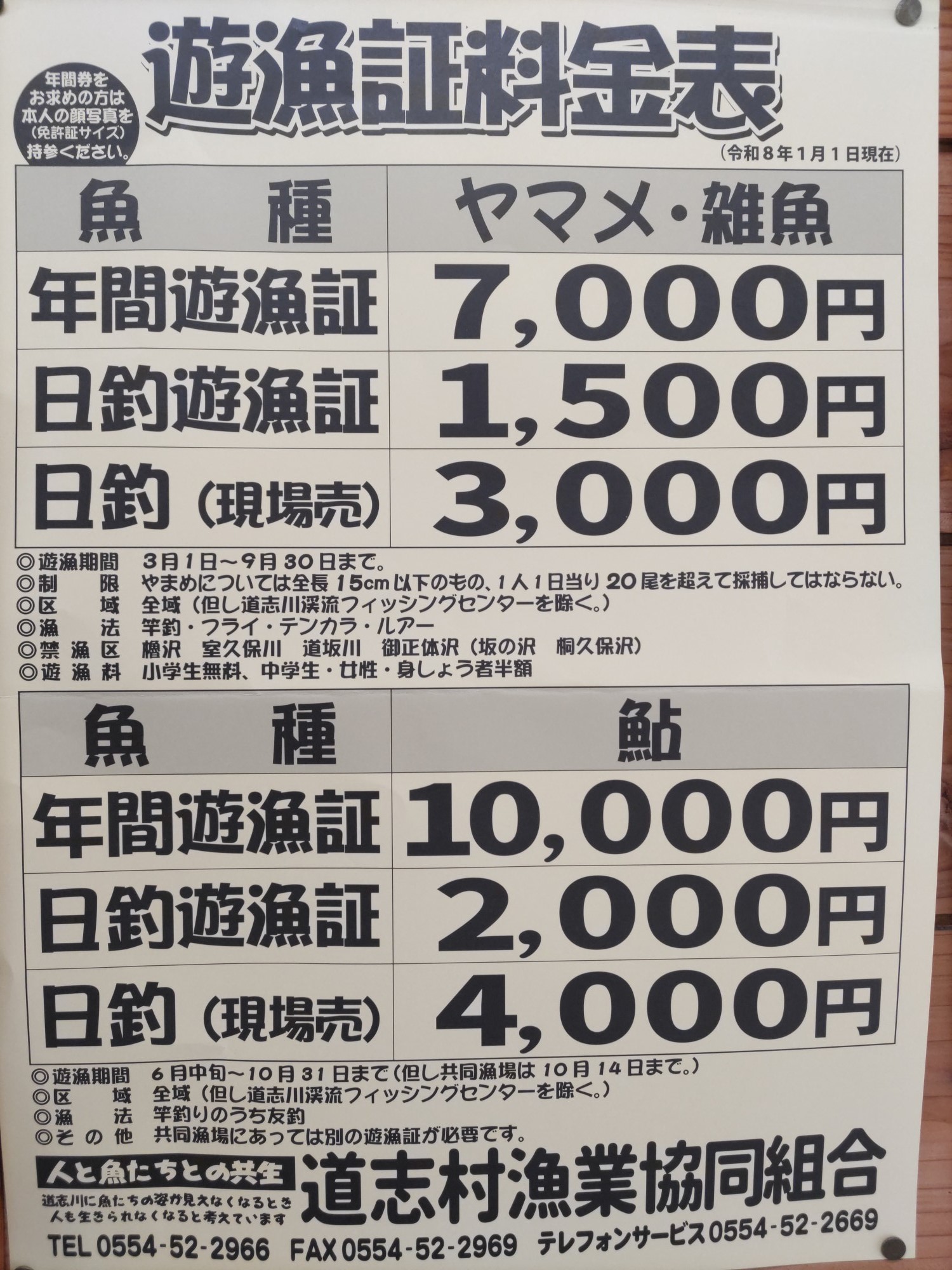 【道志川釣りマップ】※ダウンロードしてご利用ください。 ★道志川釣りマップ表 裏面 【お知らせ】 ★詳細は、フィッシングセンターホームページまで ★4月より道志川の遊漁券がオンラインで購入できるようになりました。 ◎つりチケ:道志村漁協 遊漁券一覧 | つりチケ | 超簡単に遊漁券が買える! ◎スマホアプリ フィッシュパス:道志川(道志村漁協) | FISHPASS(フィッシュパス) ★フィッシングセンターの営業について 令和7年12月〜令和8年2月末まで休業します。 ★遊漁証の料金を改定しました。 【2026年度予定】 2026年度は、下記の事業を予定しています。 皆さまのお越しをお待ちしております。 ★2026年度道志川ヤマメ・雑魚解禁 解禁日:令和8年3月1日(日) ★2026年度道志川アユ釣り解禁(4〜5月稚魚3000s放流予定) 解禁日:令和8年6月21日(日) ★釣り教室 令和8年5月17日(日) 9:00〜14:30 お問い合わせは、0554-52-2966 【お問い合わせ】 道志村漁業協同組合/フィッシングセンター:0554-52-2966 テレフォンサービス:0554-52-2669 E-メール:doushi-fc@air.ocn.ne.jp 【注意事項】 ○道志川で釣りをする場合は、遊漁証が必要になります。遊漁証取扱店で購入のうえお楽しみください ※年間遊漁証は、顔写真が必要です。(縦3cm×横2.4cm)※免許証サイズ ○鮎共同漁場(道志村漁業協同組合・相模川漁連)は、6月中旬〜10月14日までです ○道志川の一部では、禁漁区を設けています 禁漁区:椿沢・室久保川・道坂川・御正体沢(坂の沢・桐久保沢) ○制限について:ヤマメは1人1日あたり20尾以内とし全長15センチ以下のものは採捕してはいけません ○道志川漁業者専用駐車場ができました。(村内5箇所)この看板があるところです ○その他、入漁者の注意事項をお守りください ※ゴミはお持ち帰りください 詳細については、漁業協同組合までお問い合わせください 【お問い合わせ】 道志村漁業協同組合/フィッシングセンター:0554-52-2966 テレフォンサービス:0554-52-2669 E-メール:doushi-fc@air.ocn.ne.jp ◆フィッシングセンター詳細は(利用料金など)こちら |